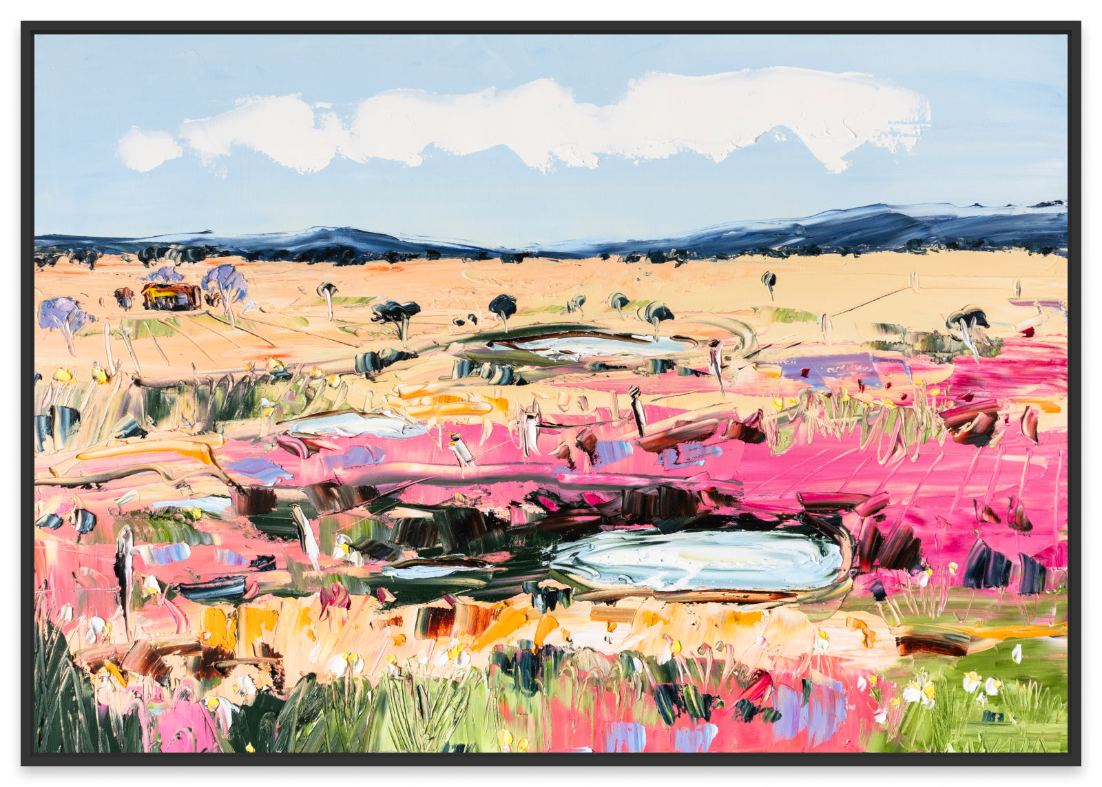Bright and bold colours feature in this abstract landscape with a splash of pink, plus mountains in the background and wildflowers in the foreground.